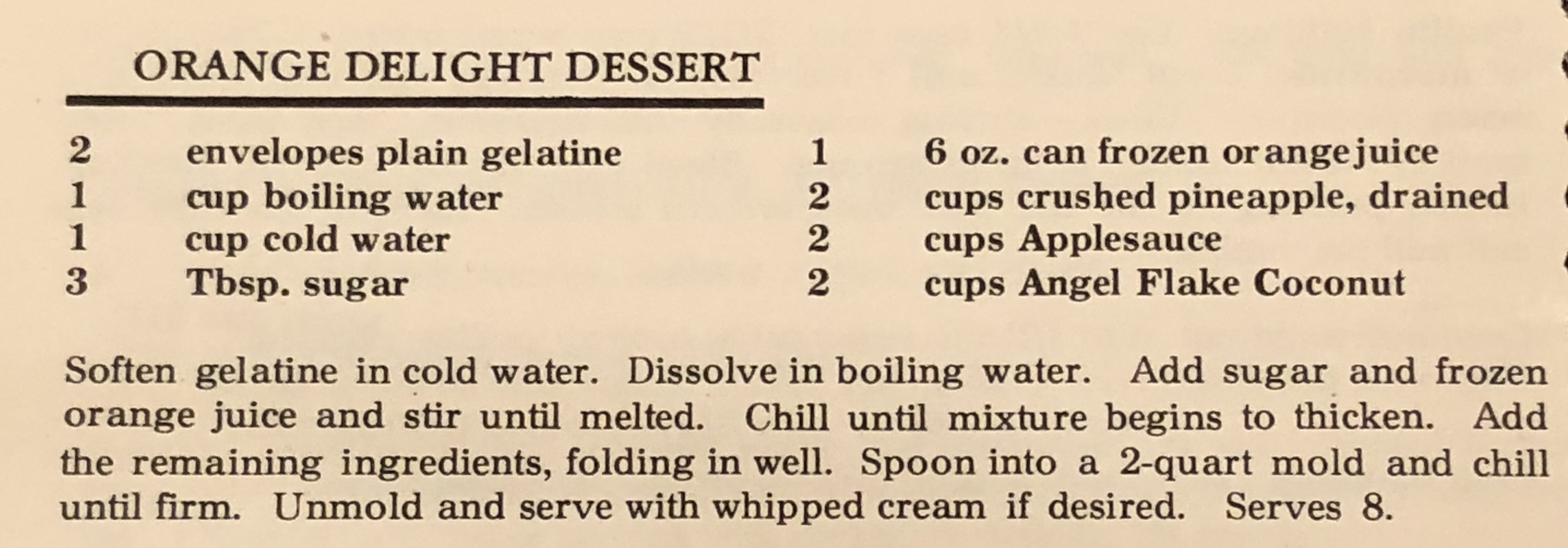Turns out that Orange Delight is surprisingly good! An actual delight. The flavor is good; tastes just like orange juice-flavored gelatin with applesauce and pineapple in it. If I were to make this again, I would definitely omit the coconut flakes and I do recommend serving it with whipped cream.