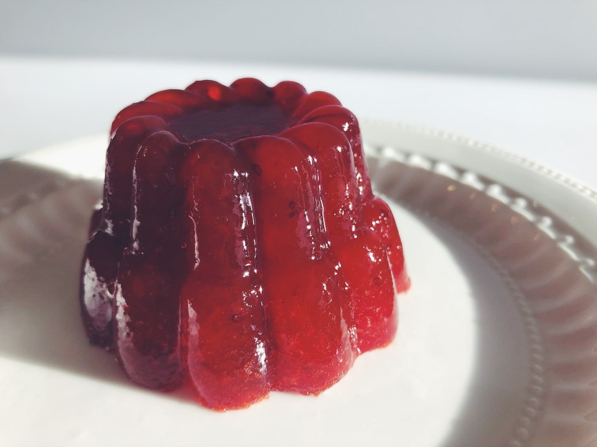 I really enjoyed this jello. It’s definitely more of a relish, like a molded cranberry sauce, and likely wasn’t meant to be eaten plain like a dessert. It would be a perfect little side for a Thanksgiving or other holiday meal and I bet it tastes awesome with turkey. I spread some on bread, just because, and that wasn’t too bad either.
