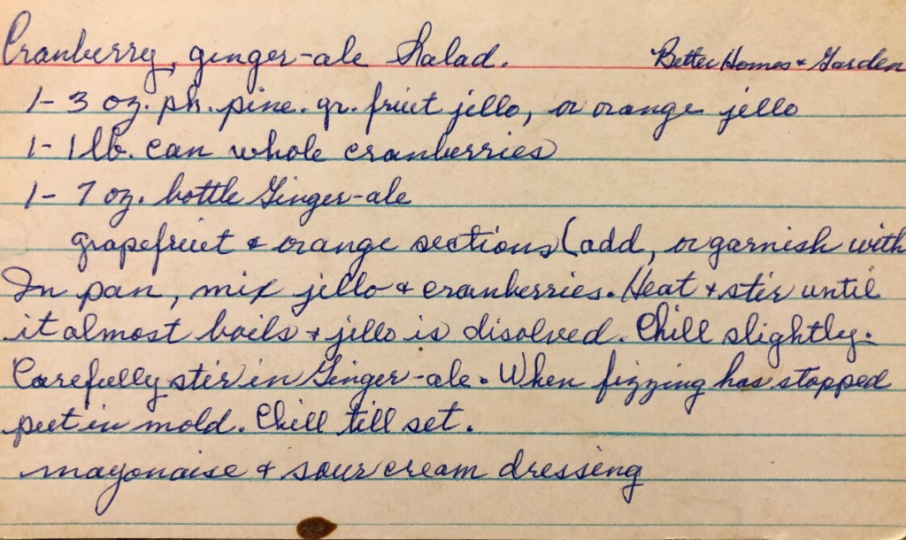 This recipe is probably 60’s but I honestly don’t know. What I do know is that Pineapple-Grapefruit flavored Jell-O was introduced around 1961. If you weren’t already aware, that flavor has long been discontinued. I can’t find any more definitive info on when that happened. Island Pineapple came out in 1995 (years after my great-aunt passed away) so Pineapple-Grapefruit must have disappeared sometime before then.
