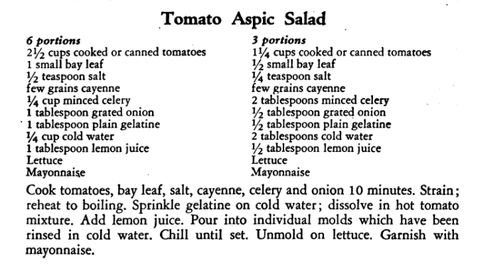I spend a good deal of time flipping through old cook books and nearly every book containing salads and gelatins between 1920-1940 has a tomato aspic in it. Midcentury aspic recipes of any kind are not that difficult to find.