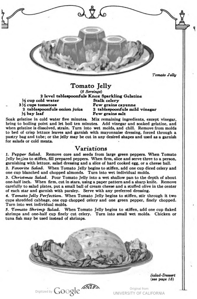 As an added bonus, here is another tomato aspic recipe from 1927, complete with a list of variations. It is near-identical with the exception of using vinegar instead of lemon juice.