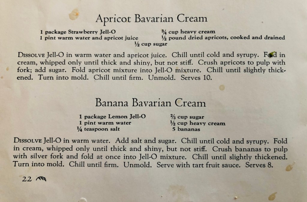 According to the booklet, there are two ways to make a Jell-O cream. One requires whipping the jello before adding whipped cream, the other is adding sort-of whipped cream to un-whipped jello. Banana Bavarian is made using the un-whipped method. I’ll try a whipped one next time. Apricot Bavarian Cream is made the same way (see below).