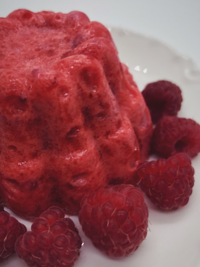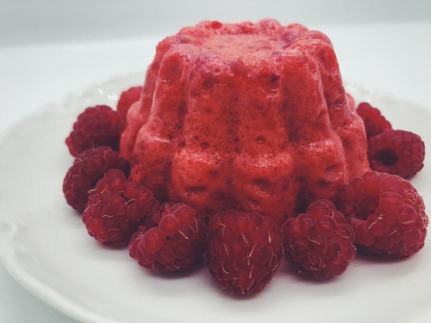 If you’ve done this right your jello should already be pretty thick and will set very quickly. I’d give it a couple hours just to be safe. Unmold and garnish with some raspberries.