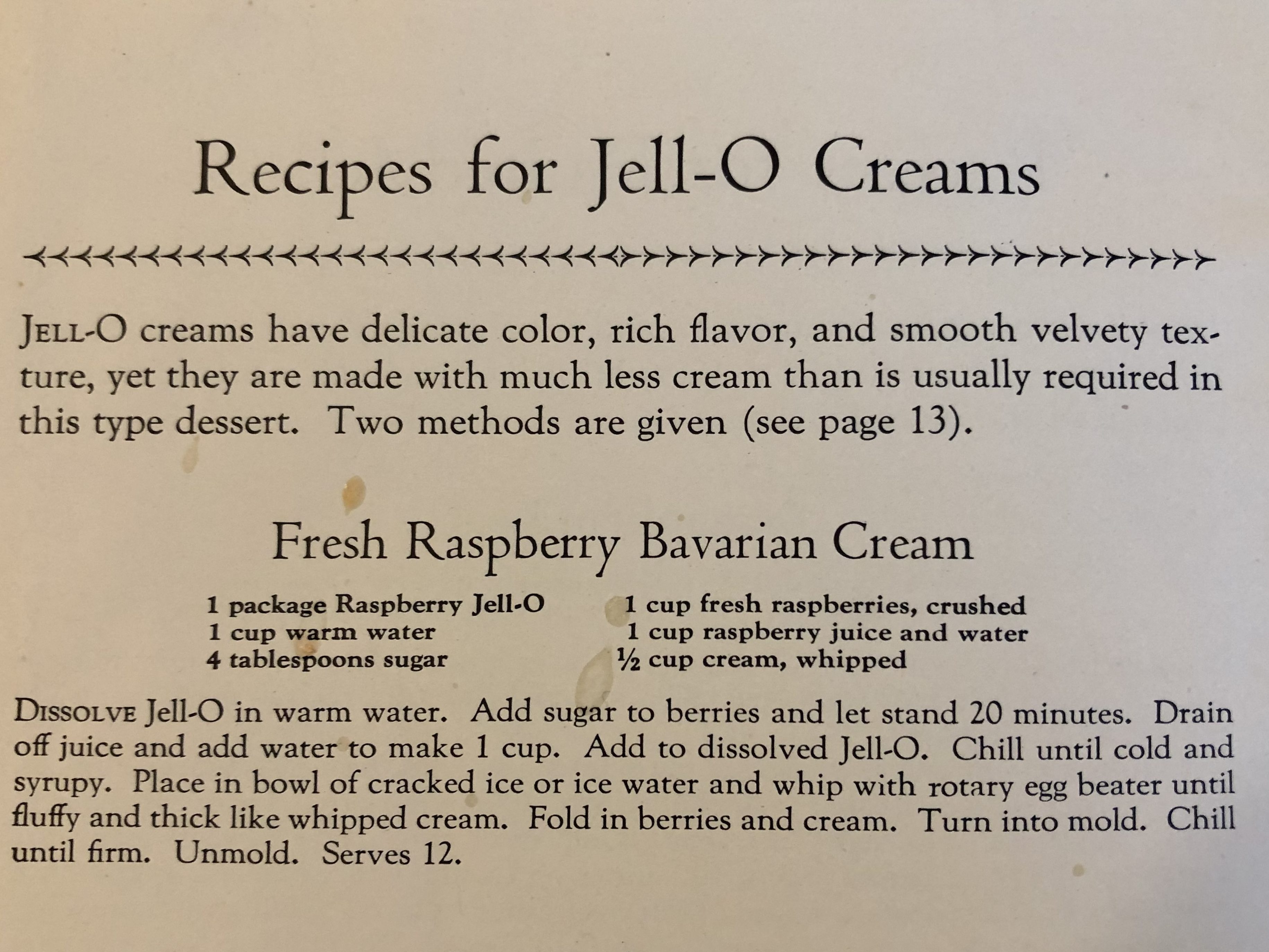 In my last post I wrote that I was going to try a whipped Bavarian cream, so I did. This recipe is yet another from my trusty 1936 booklet, What you can do with Jell-O.
