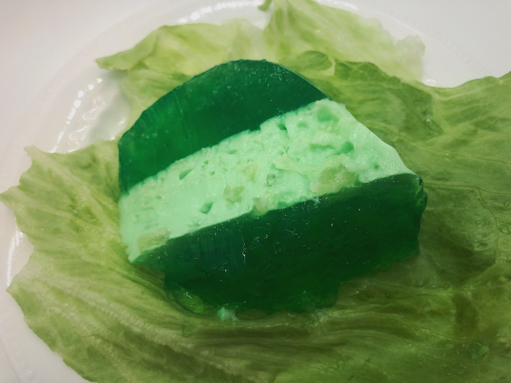Regardless, this was a pretty good jello salad. Like many 50’s salads it tasted a bit like church funeral food, but my husband liked it and I didn’t mind it at all. I personally prefer creamy jello over the standard plain, but the three layers worked together nicely. The middle layer had the most flavor, but I think the two layers of plain lime jello balanced it out really well, especially with the dressing.