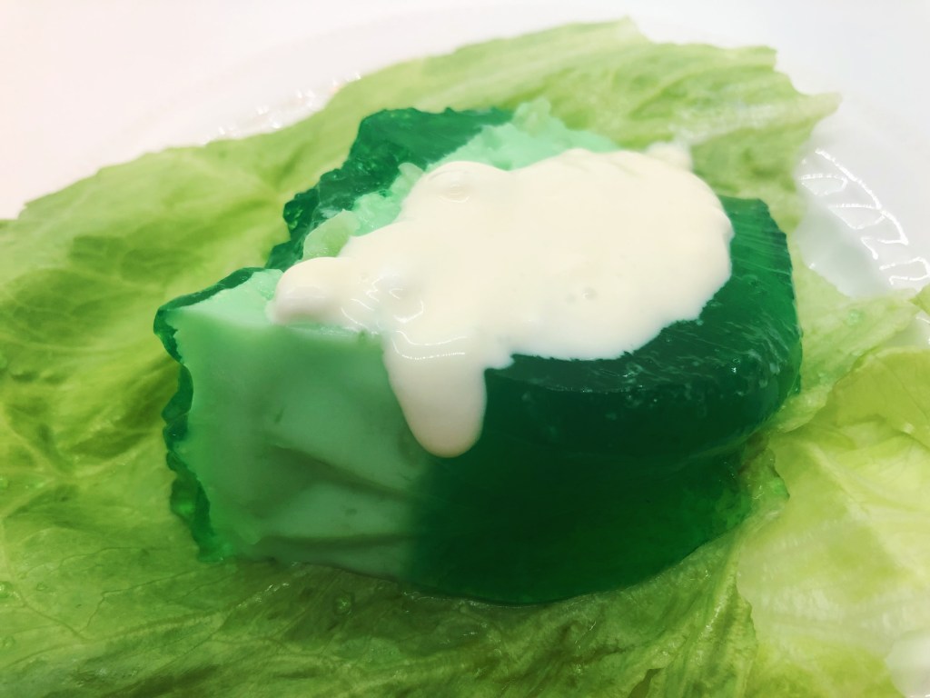 There was a bit of a snafu with the bottom layer after unmolding. It was probably a combination of my ill-fated attempt to perfectly center the unmolded jello on the tray for pictures and the fact that the bottom layer just couldn’t bear the weight of the other two for too long. Some people add plain gelatin to the mixture in order to make the mold extra firm for presentation and slicing, but I don’t because I’m shooting for 100% accuracy here.