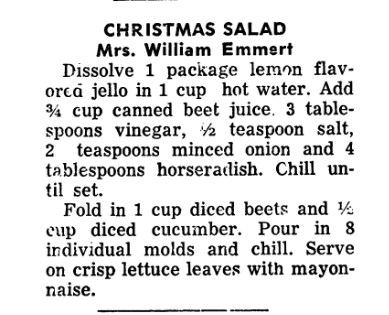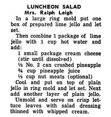 I’ve done a few 50’s jello salads now and what I’ve noticed about the era is that they are generally quite large, require little to no actual cooking skill, and nearly always include a canned food and/or some kind of dairy product like cheese or mayonnaise. The sweet ones do, anyway. The savory salads and relishes were still very popular, and they got a bit weird during this era with ingredients like horseradish, pimiento and onions. I found a Christmas Salad recipe in this same book that sounds particularly off-putting, which I will absolutely be making in December.