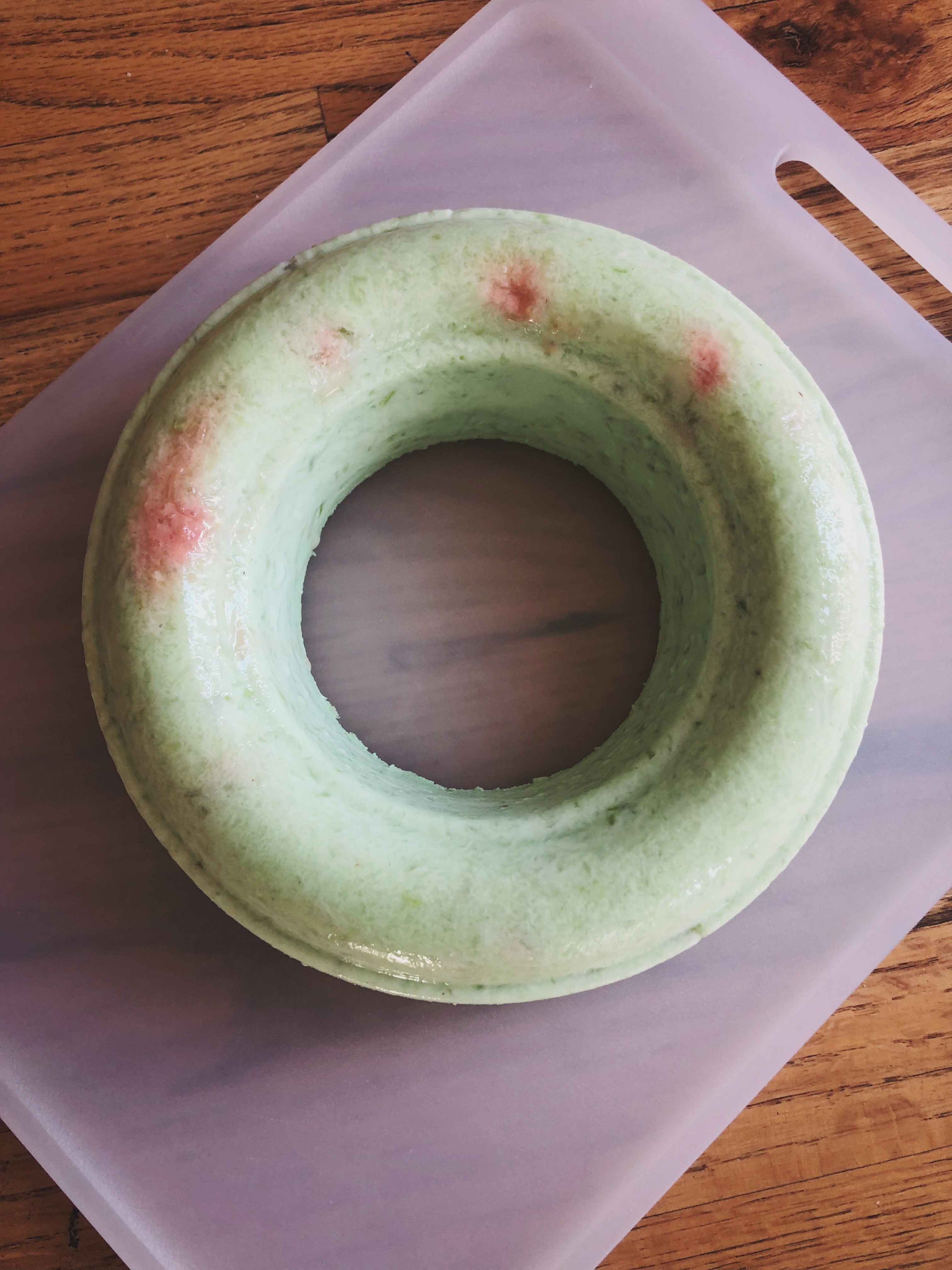 3. Mix together then fold in the whipped cream. Pour into a mold and dot with cherries. The recipe simply says “cherry” so I’m assuming this means maraschino cherries. All signs point to maraschinos.