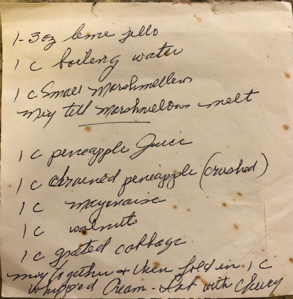 Today’s recipe comes from my grandma’s files. It doesn’t have a title, so it’s possible this salad originally had a fancy name like Ambrosia or something like that. I don’t run into a lot of jello recipes that call for cabbage so of course I had to give this one a try. It’s possible my grandma scribbled it down in the 1960’s, but my gut tells me it’s 1950’s.