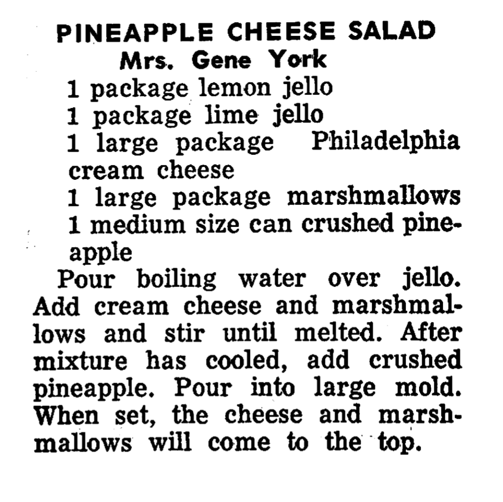 To save time, I revisited a past jello salad source, a digitized cookbook called The Courier-Times Book of Famous Recipes, which is a 1952 collection of recipes gathered from staff and readers of The Courier Times of Newcastle, Indiana. The Pineapple Cheese Salad recipe stood out because it sounds a little weird but is also deceptively simple to make and doesn’t require any cooking, whipping, or layering.
